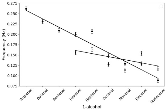 Frequency values of the two peaks with similar frequency for the alcohols exhibiting fundamental peaks in their Fourier transforms shown in Figure 4. For methanol through 1-pentanol, the frequency position of the fundamental peaks is shown as a solid black circle. Then, the second peak arises from 1-hexanol onward; the peak that follows the linear trend is also plotted as a solid black circle. The second peak shifts to a lower frequency more softly, and each datum is marked as a black X. Error bars represent the resolution of the Fourier transform.