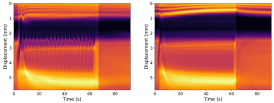 Homewritten software (available at https://github.com/ulnessd (accessed on 1 May 2024)) was used to convert each .h264 video file into a single still image, referred to here as the heatmap representation of the data. The heatmap was produced by averaging the columns (or selected range of columns) of each frame of the video. The resulting average columns for all the frames were then assembled in time order to produce the two-dimensional heatmap. Figure 2 shows a typical heatmap with the key features pointed out.