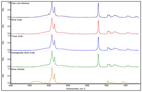 Dimer and trimer acids and hydrogenated dimer acids display essentially the same band pattern in the infrared spectra (see the FT-IR spectra in Figure 3). Even the spectrum of oleic acid, taken as a reference, appears practically identical to the spectra of dimer and trimer acids (Figure 3). The unique distinctive feature in the oleic acid infrared spectrum is the weak band at 3005 cm−1 due to ethylenic =CH stretching. In all cases, the infrared spectra of the oleic, dimer, trimer and hydrogenated dimer acids are dominated by the C=O stretching of the COOH group at about 1710 cm−1, while the C=C stretching expected at 1600 cm−1 is not detectable in the infrared spectra.