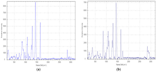 Regarding the other Raman lines observed in the spectrum of the dimer acids, it is interesting to notice that these bands are very similar to those observed, for instance, in the Raman spectrum of oleic acid (Figure 5a). In the case of oleic acid, the cis-C=C stretching band is very strong, even stronger than that observed in the spectrum of dimer acids. However, also in the Raman spectrum of oleic acid, the C=O stretching is not detectable (Figure 5a). The C=O stretching band appears in the Raman spectrum at about 1740 cm−1 only in ester ethyl oleate (Figure 5b) and is easily distinguished from the C=C stretching band. All esters, including the glycerides of oleic acid, show both the νC=C and νC=O bands in the Raman spectra.