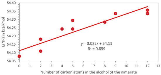 Correlation between the E(NR) values of dimerates and trimerates listed in Table 3 and the number of carbon atoms present in the alcohol of the ester.