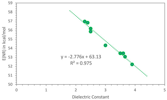 Because of the success of the E(NR) polarity scale with a series of carboxylic acids, a series of alcohols (including dimer alcohol and glycerol formal, both from renewable sources) was also studied in the same way (see Table 2), and in this case, a fair correlation between the E(NR) scale and the dielectric constant of the alcohols considered was found. A linear correlation was found, as shown by Equation (4). However, when selecting alcohols with linear structures, the correlation of E(NR) with ε assumes a form of a power law of Equation (5).