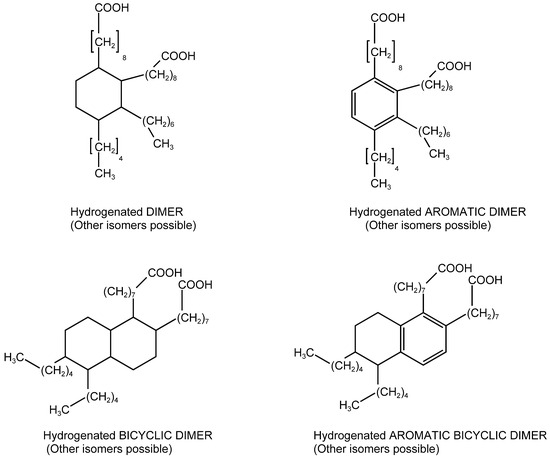 Typical chemical structures of hydrogenated dimer acids; many other isomeric structures other than those shown can be conceived.