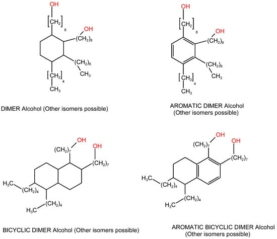 The hydrogenation can be pushed further to reduce the carboxylic functionalities into alcohol groups. In such a way, dimer alcohols are also produced, with the same structure as hydrogenated dimer acids but with –OH groups in place of –COOH groups. Examples of chemical structures present in dimer alcohols are shown in Scheme 3 [11].