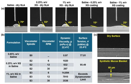 Fluid properties: (a) Contact angles of various liquids on a 3D-printed flat plate made of rigid transparent SLA resin under different surface conditions (dry and coated with synthetic mucus blankets of two consistencies: 0.25% w/v xanthan gum and 1% w/v xanthan gum); (b) dynamic viscosity and surface tension of saline nasal spray solution and xanthan gum saline solutions used as synthetic mucus. All measurements were conducted at a temperature of 22.4 °C. (c) Side-view images of the flat SLA resin plate under dry conditions and uniformly coated with a synthetic mucus blanket.