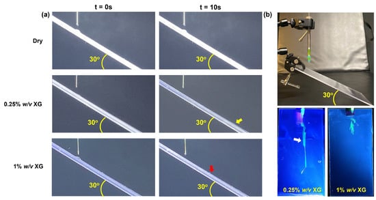 (a) Translocation distance of a single saline drop dispensed on a 30° inclined flat SLA resin surface over 10 s, under various surface conditions (dry, coated with 0.25% w/v xanthan gum saline solution, and 1% w/v xanthan gum saline solution); (b) top panel: experimental setup for the drop tests, showing the threaded plunger syringe used to dispense the drops and the inclined flat SLA plate; bottom panels: top view illustrating liquid behavior after dispensing a saline drop on the 30° inclined SLA plate coated with 0.25% w/v XG and 1% w/v XG.