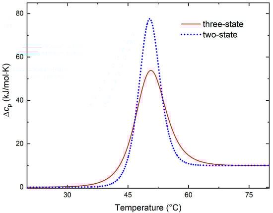 An example of the curves computed for the two-state system referenced to the lowest enthalpy “folded” state ( = 50 °C, kJ/mol, kJ/mol·K) and a three-state system with an additional state ( °C, kJ/mol, kJ/mol·K) is presented in Figure 1. The procedure for creating the curves is described in Appendix A.