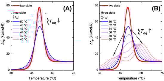 Theoretical equilibrium DSC curves for a three-state system with an additional state I3 (A) kJ/mol, kJ/mol·K, from 50 °C (blue curve) to 40 °C (pink curve) with 2 °C steps, (B) kJ/mol, kJ/mol·K, from 50 °C (blue curve) to 60 °C (pink curve) with 2 °C steps, blue line corresponds to a two-state curve from Figure 1.