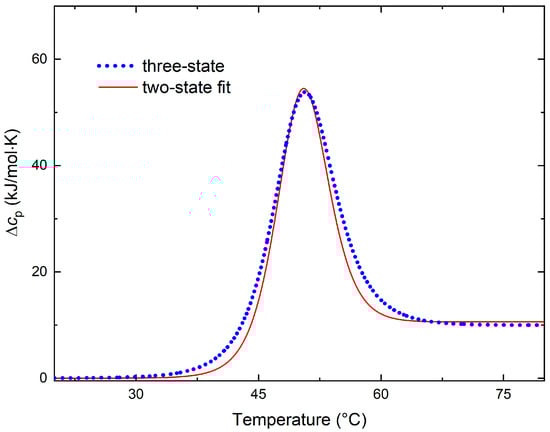 The two-state fit of the theoretical calorimetric curves was performed by setting , , and as variable fit parameters and minimizing the absolute difference between the fitting and fitted curves. The baseline required for evaluation of was constructed via the iterative integral method [52].
