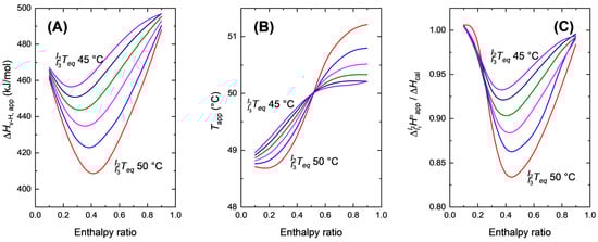 The values of the apparent transition enthalpy (A) and temperature (B) determined by fitting a two-state model curve to theoretical curves for a three-state system vs. the ratio of the enthalpies of the “main” low enthalpy state and the enthalpy of an additional state, referenced to the enthalpy of the high enthalpy state. Graph (C) demonstrates the ratio between the apparent enthalpy difference between the two states determined by the fitting, divided by the apparent calorimetric enthalpy of the transition.