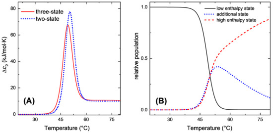 An important behavior is observed when the additional state has an enthalpy that is close to any of the “major” states. If the enthalpy of an additional state is close to that of the high enthalpy, i.e., “unfolded” state, the three-state curve deviates quite significantly from the two-state curve both in the area of the peak and the peak temperature (Figure 5, left). However, the resulting curve can be excellently fitted with a two-state model. This behavior is a result of the low enthalpy difference between the two high enthalpy states, so the corresponding equilibrium constant does not change much with the temperature, and a significant population of the additional state is present over a wide temperature range above the calorimetric peak (Figure 5B). The enthalpy uptake caused by the conversion between the states is spread over a large temperature region and “looks” like a constant excess heat capacity. The apparent fit parameters ( kJ/mol, kJ/mol, °C, kJ/mol·K) are quite different from the thermodynamic parameters of the states used to produce the three-state theoretical curve. In this situation, there is no practical means of distinguishing a three-state system from a two-state one based on the calorimetric data alone, especially considering experimental limitations due to instrument noise, baseline quality, etc., so other methods should be used to determine the presence of additional stable conformations.