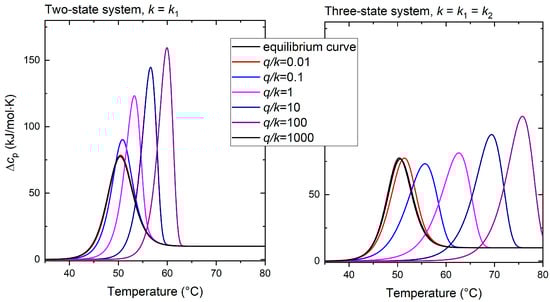 Calorimetric curves of two-state and three-state systems at different ratios between the scanning rate q and kinetic constant k. Two-state system parameters °C, kJ/mol, kJ/mol·K,