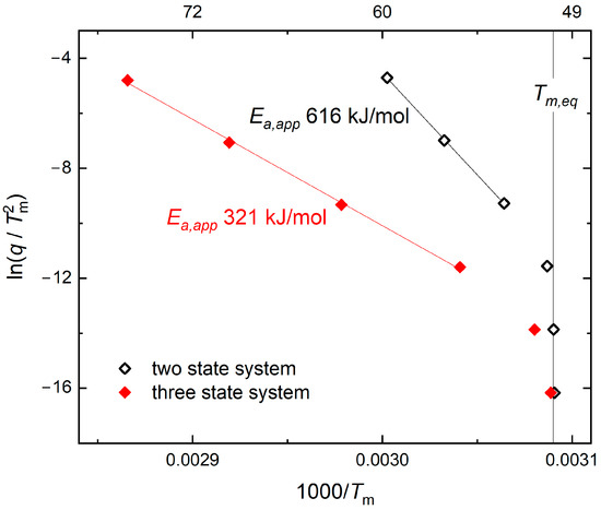 Kissinger plot of the peak positions from Figure 6 with the resulting apparent activation energies of the processes. Where q is the scanning rate and Tm is the temperature of the peak on the calorimetric curve.