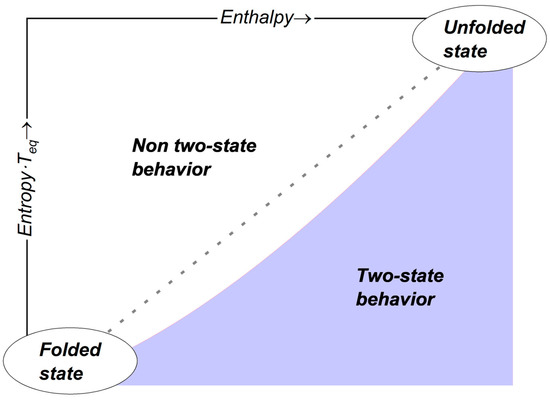 For the folding intermediates to be “hidden”, their thermal stability must be lower than that of the folded state over a wide temperature range. In the above description, the relative stability of the states was expressed as the temperature at which the free energy of the conversion between the states is zero. The inverse of this temperature is a measure of the entropic “penalty” for a given enthalpy reduction. Thus, for the multistate system to display a two-state-like behavior, the entropy loss must be greater for “hidden” intermediates than for the folded state. Schematically, this is represented in Figure 8. If the folding intermediates fall into a two-state “zone”, the system will behave like a two-state one.