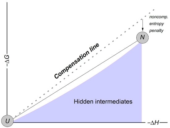 The native protein structure is maintained by a variety of intra- and intermolecular interactions that are rearranged upon unfolding. The associated thermodynamic parameters are expected to conform to Equation (5). Particularly, extraction of the non-compensated entropy term in Equation (5) can clarify the extent of hydrogen bonding network change upon folding and the nature of hydrophobic effects. The hydrophobic effects upon solvation are traditionally associated with the formation of cavities in the solvent, whose geometry depends on the solute size [40]. The use of a compensation relationship in the form of Equation (5) has previously enabled the quantification of the thermodynamic parameters of solvophobic effects upon solvation in numerous solvents, including water, and correlated these with the solute molecular volume [41,42]. The Gibbs energies of both I1 to I3 and I1 to I2 transitions include the term, which is the sum of contributions from each elementary denaturation step. For “hidden” intermediates formation, it is reasonable to assume that the negative entropic penalty depicted in Figure 8 is also non-compensated, i.e., does not depend on the interaction strength. The expected qualitative vs. relationship in a multistep denaturation process is shown in Figure 9. The deviation from the compensation line would be greater for intermediate steps than for unfolding. Quantitative analysis of such deviations might be of interest in the future.