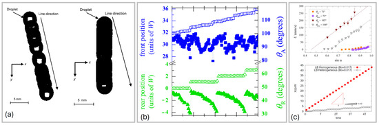 - Herde, D.; Thiele, U.; Herminghaus, S.; Brinkmann, M. Driven Large Contact Angle Droplets on Chemically Heterogeneous Substrates. Europhys. Lett. 2012, 100, 16002. [Google Scholar] [CrossRef][Green Version]
