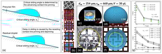 - Ding, Y.; Jia, L.; Peng, Q.; Guo, J. Critical Sliding Angle of Water Droplet on Parallel Hydrophobic Grooved Surface. Colloids Surfaces A Physicochem. Eng. Asp. 2020, 585, 124083. [Google Scholar] [CrossRef]