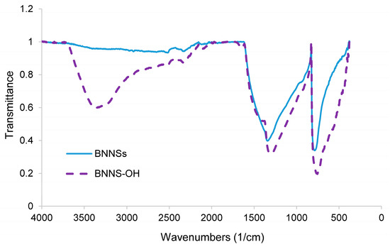 To increase the reactivity of boron nitride, a pre-treatment step is necessary. The chemical inertness makes the oxidation step challenging, and it therefore requires harsh conditions. Based on previous work on boron nitride nanotubes [39], the BNNSs were treated with concentrated nitric acid (69%) in a sonication bath for approximately 24 h, followed by a washing process with distilled water. A strong oxidation with nitric acid allowed the OH groups to be chemically linked to the boron atom. Due to the high electronegativity of the nitrogen atom, the negatively charged OH groups would bond to the electron-poorer boron atom, which served as a Lewis acid. After washing with water, the water was then removed via centrifugation, and the BNNS-OH was washed twice with toluene. The insolubility of water in toluene (0.03% at 25 °C) protected the nanosheets from adsorbing too much water from the environment, as this first step of the functionalization was performed under atmospheric conditions. Figure 1 illustrates the FT-IR spectrum of the oxidized boron nitride nanosheets (BNNS-OH) in comparison to the untreated BNNSs.