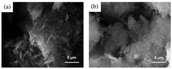 The intense peaks at approximately 1350 cm−1 and 780 cm−1 corresponded to the B-N in-plane (stretching) and out-of-plane (bending) vibrations, respectively [40]. These peaks were clearly visible in both the untreated as well as the oxidized BNNSs, as expected. However, the FT-IR spectrum of BNNS-OH showed a new broad band that was quite evident at around 3100–3500 cm−1. This vibration is typical for hydroxyl groups, as previously reported in the literature [41,42]. Although this band might also appear due to traces of water that might still be in the system, the visible B-O vibration, though not as apparent as the latter, is an indicator of the B-OH bond. The absorption band associated with the B-O stretching vibration was identified at 1370 cm−1 as well as at 570 cm−1. These values were consistent with the spectroscopic data reported by Shurvell and Faniran [43]. The B-O vibrations were not as apparent as the B-N and the O-H, since they overlapped with the very intense B-N vibrations at 1350 cm−1 and 780 cm−1. The small peaks at 2100 cm−1, 2300 cm−1, and 2500 cm−1 were seen in both spectra, and because they could not be assigned to any known vibrations within the BNNS-OH molecule, they were possibly artifacts. The FT-IR spectrum illustrated in Figure 1 clearly shows the successful oxidation of the boron nitride nanosheets. Furthermore, scanning electron microscopy (SEM) was used to determine the form and shape of the nanosheets. Since the sample was in its dry form and at a high concentration, the boron nitride nanosheets appeared to have flocculated, as can be observed in the SEM image in Figure 2. Nevertheless, their two-dimensional shape was well visible. Furthermore, the SEM image showed the polydispersity of the sample, demonstrating different radii and thicknesses of the boron nitride nanosheets. Monolayers were difficult to find due to their very thin nature, but few-layered as well as flocculated nanosheets are illustrated in Figure 2.