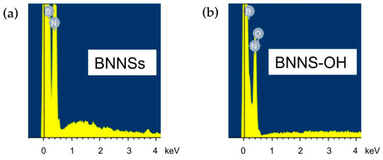 In addition to SEM, energy-dispersive X-ray spectroscopy (EDX) was also performed. EDX spectra of the non-modified BNNSs as well as the oxidized ones were collected to confirm that there were no other elements contained other than boron and nitrogen, as well as oxygen in the case of BNNS-OH.