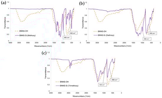 FT-IR spectra of the boron nitride nanosheets that are functionalized with (a) (3-aminopropyl)dimethylmethoxysilane, (b) (3-aminopropyl)diethoxymethylsilane, and (c) (3-aminopropyl)trimethoxylsilane, in comparison to the BNNS-OH.