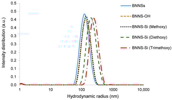 As expected, the B-N vibrations were visible at approximately 1350 cm−1 as well as 780 cm−1 [40]. In Figure 5a, the two small but sharp peaks at 1260 cm−1 and 750 cm−1 were associated with Si-CH3 vibrations that stem from the methyl groups on the silane [50]. A further vibration that arises from the silane was that of the Si-CH2 bond, and it was visible as a sharp band split into two components at around 1200 cm−1 and 1220 cm−1, corresponding to the propyl chain [50]. The strong band at around 1150 cm−1 was attributed to the Si-O vibration [51], and the vibration bands at 530 cm−1 and at 505 cm−1 were associated with the B-O bond [43]. However, the main indicator that the silane was bound covalently to the boron nitride and not just adsorbed on the surface was the sharp band at 980 cm−1 and the one at 640 cm−1, which corresponded to the B-O-Si vibration [52,53,54,55]. The high intensity of this band showed the successful functionalization of BNNSs with (3-aminopropyl)dimethylmethoxysilane. The FT-IR spectrum demonstrated in Figure 5b showed a broad band at approximately 1100 cm−1, which masked many of the other bands near that area. This strong band was attributed to a Si-OCH2CH3 vibration [50] or a Si-O-Si bond. The Si-O-Si absorption was also observed at 460 cm−1 as a weak band. This indicated that the silanes bond to the boron nitride, as well as to each other, forming siloxanes. Furthermore, the presence of the Si-OCH2CH3 vibration showed that not all alkoxy groups had reacted to bond to the BNNSs or another silane. The Si-CH3 and Si-CH2 vibrations appeared at 1300 cm−1 and 1220 cm−1, respectively [50], and the B-N vibrations were visible at 1350 cm−1 and 780 cm−1, as expected [40]. Moreover, Figure 5b showed the B-O absorption at 510 cm−1 and 530 cm−1 [43], as well as a weak band at around 2920 cm−1, which was attributed to the primary amine. The B-O-Si bond was demonstrated by a sharp absorption band at 980 cm−1 as well as a weaker one at approximately 640 cm−1 [52,53,54,55]. The B-O-Si vibration once again showed the successful functionalization of BNNSs with (3-aminopropyl)diethoxymethylsilane. In contrast to Sun et al., whose FT-IR did not display the peaks corresponding to the B-O-Si vibration [33], we were able to identify this vibration in all three syntheses. In Figure 5c, the amine vibration was shown at 2900 cm−1, together with a sharp band at 2840 cm−1, which could be attributed to the Si-O-CH3 vibration [50], indicating the presence of some unreacted methoxy groups. The weak band that is almost masked by the broad B-N vibration at 1150 cm−1 was attributed to the Si-O bond, and the apparent bands at 1120 cm−1, 1020 cm−1, and 440 cm−1 were attributed to the siloxane Si-O-Si bond [50]. The B-O-Si vibration that represented the covalent functionalization of the BNNSs was displayed as a weak band appearing as a shoulder at 930 cm−1 and 690 cm−1 [52,53,54,55]. In comparison to the other two reactions, this FT-IR spectrum showed that the silane was bound more in the form of a siloxane network on top of the boron nitride nanosheet, which was expected due to the high number of the reactive methoxy groups. This led to a slight increase in size, as demonstrated by dynamic light scattering (DLS). Figure 6 illustrates a comparison of the hydrodynamic radius of the BNNSs, the oxidized boron nitride nanosheets (BNNS-OH), as well as the functionalized BNNSs with all three different alkoxysilanes.
