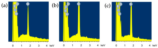 EDX spectra of boron nitride nanosheets that are functionalized with (a) (3-aminopropyl)dimethylmethoxysilane, (b) (3-aminopropyl)diethoxymethylsilane, and (c) (3-aminopropyl)trimethoxysilane. In addition to boron and nitrogen, oxygen, carbon, and silicon were also detected.