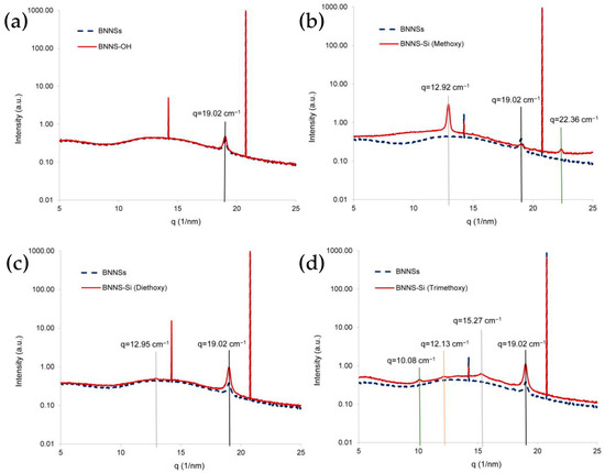A comparison of the length of the scattering vector q of the untreated BNNSs and (a) the oxidized boron nitride nanosheets (BNNS-OH), (b) the BNNSs that are functionalized with (3-aminopropyl)dimethylmethoxysilane (BNNS-Si (Methoxy)), (c) the BNNSs that are functionalized with (3-aminopropyl)diethoxymethylsilane (BNNS-Si (Diethoxy)), and (d) the BNNSs that are functionalized with (3-aminopropyl)trimethoxysilane (BNNS-Si (Trimethoxy)).