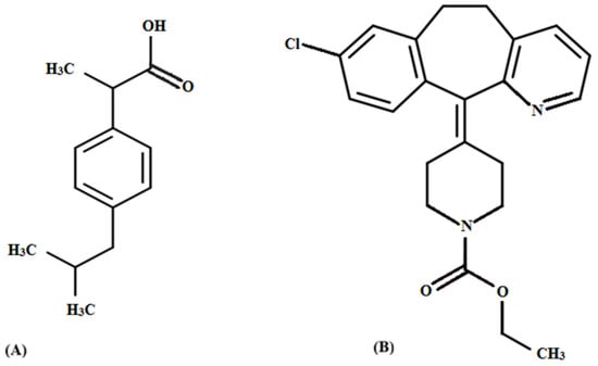 Chemical structure of (A) ibuprofen and (B) loratadine.