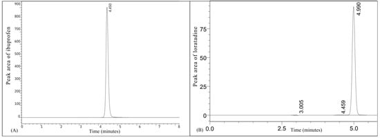 Representative chromatograms of (A) ibuprofen and (B) loratadine.