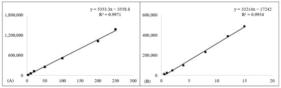 Calibration curves for (A) ibuprofen and (B) loratadine. Square markers (■) show the measured calibration points, and solid lines represent the regression fits.