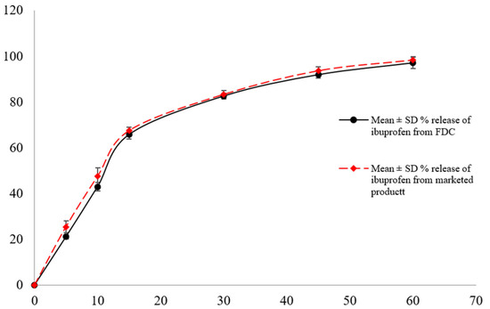 Ibuprofen dissolution profile from FDC and marketed suspension in pH 7.2 phosphate buffer as dissolution media (mean ± SD, n = 6).