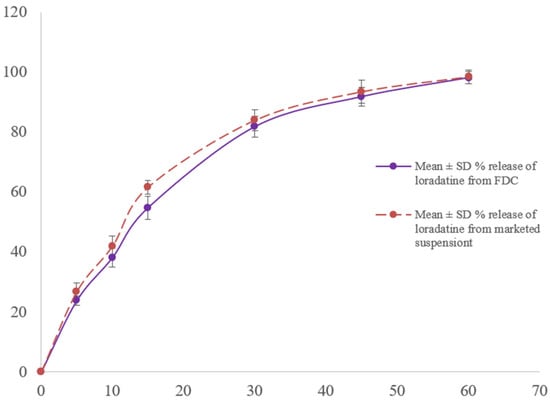 Loratadine dissolution profile from FDC and marketed suspension in 0.1 N HCl as dissolution media (mean ± SD, n = 6).