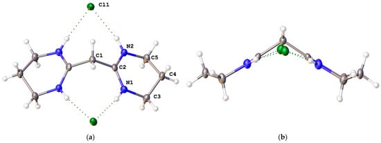 Salt [5H]Cl2 forms in the monoclinic space group P21/n with two dications and four chlorides in the asymmetric unit (Figure 4a). The two dications adopt the same conformational arrangement in which one seven-membered ring has a twisted-envelope-like conformation and the other has a distorted twist conformation (Figure 4b). The twist in each ring arises because the methylene groups attached to the amidinium CN2 atoms lie out of the CN2 plane. In the twisted envelope (top right and bottom left of Figure 4b), the N2–C2 vector forms an angle of 9.61(10)° with the amidinium plane (C1-C2-N1-N2), whereas the N1–C7 vector forms an angle of −12.31(10)°. In the distorted twist ring (top left and bottom right of Figure 4b), the N4–C8 vector has an angle of 18.4(1)° to the amidinium plane (C1-C3-N3-N4), whereas the N3–C11 vector forms an angle of 18.0(1)°. There are similar twists in the other dication. As with [4H]2+, the amidinium C–N bond distances are short; they lie in the range 1.3107(16) to 1.3173(17) Å. Again also, each chloride is chelated by two NH groups, one from each amidinium.