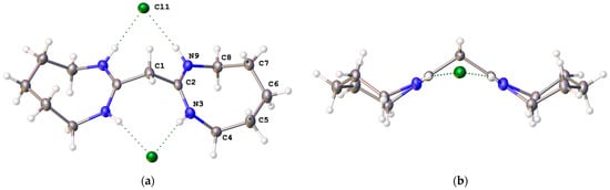 (a) Labelled solid-state structure of [6H]Cl2; (b) side view of [6H]Cl2 through the amidinium planes.