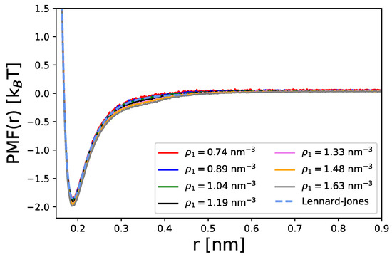 Potentials of mean force calculated from Equation (41) for different densities of spherical particles. The blue dashed line is the analytic result for the Lennard-Jones potential for interactions between two particles.