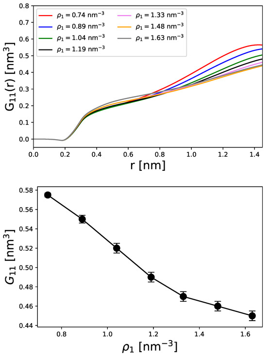 In general, KB integrals can be interpreted as excess volumes relative to the ideal state [48]. Accordingly, all KB integrals show a slight decrease at short distances nm due to excluded volume effects. A rapid increase in the KB integrals can be observed between nm, which corresponds to the first contact pair in agreement with Figure 1. For larger distances than nm, the KB integrals finally converge to a constant value as defined by Equation (29) and shown in the bottom panel of Figure 3. With reference to Figure 3, the corresponding values of are ordered as a function of the particle density. This means that higher particle densities lead to smaller KB integrals. Such findings are consistent with the accumulation effects already observed. Since KB integrals represent the deviation from an ideal state, it can be concluded that higher particle densities deviate more strongly from a homogeneous distribution.