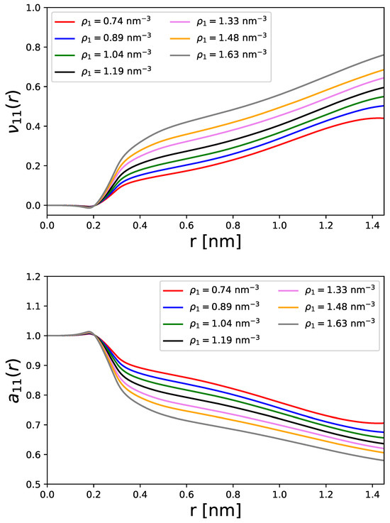 As can be seen, the particles reveal a pronounced short-range ordering as reflected by the high peak values at nm. This local ordering can be attributed to the attractive part of the Lennard–Jones potential, which induces slight accumulation effects in terms of first-contact shells. In accordance, one can recognize a steep decrease in the radial distribution functions with a convergence to at distances nm, which highights the transition from local to bulk regions. At particle densities of nm−3, the formation of a slight shoulder between nm can be identified, which indicates the formation of larger or even second-order contact pair shells. In summary, one can conclude that the particles show slight accumulation effects due to attractive Lennard–Jones potentials.