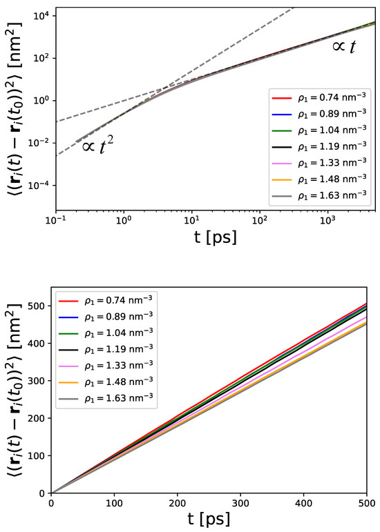The corresponding representation in a log–log plot shows the presence of two regimes, which are known as ballistic and diffusive regimes [78,79]. The ballistic regime scales with , which can be attributed to the initial motion of particles for short times. This finding is also important for LD simulations (Equation (37)), as the mass is not neglected in contrast to Brownian Dynamics simulations. For later times, the particles usually follow the diffusive regime, which is characterized by Equation (47) and thus a linear scaling with time . It can clearly be observed that all particle densities have a comparable transition time between ps, where the diffusive motion dominates for longer times. The coincidence of these values highlights the non-existent correlations between the particles, so that the transition time depends only on the mass and the friction coefficient. Further evaluation of the MSDs for different particle densities is shown in the bottom panel of Figure 5. One can notice that the MSDs decrease for increasing particle densities.