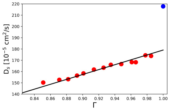 The black solid line depicts a linear regression in agreement with Equation (35) for a constant value cm2/s with fit value cm2/s. The correlation coefficient reads with the observed , calculated , and mean values of the N diffusion coefficients. Accordingly, the corresponding self-diffusion coefficients scale with the derivative of the thermodynamic activity in agreement with Equation (35). In addition, the analytic result of Equation (34) with cm2/s is in good agreement with the corresponding data point at (blue sphere) in Figure 6, which corresponds to the evaluation of the diffusion coefficient for a single particle with .