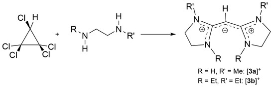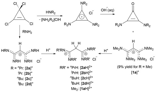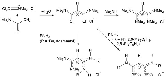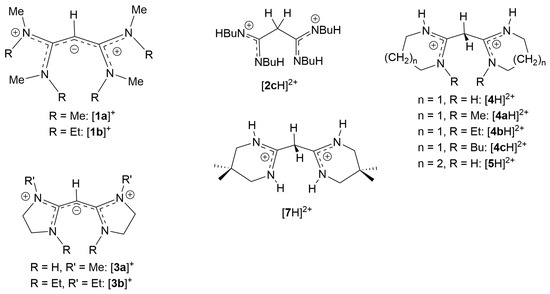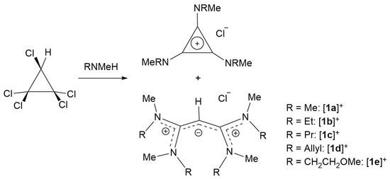 5H and the appropriate secondary amine, RNMeH. Alkylated ethylenediamines similarly yield bicyclic allyldiamidinium salts, whereas longer diamines (H