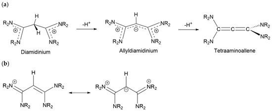 This work reports on novel acid–base conjugate pairs of monocationic allyldiamidinium and dicationic diamidinium salts, some of which are ionic liquids (ILs) at ambient temperatures. A series of allyldiamidinium salts of the general formula [C