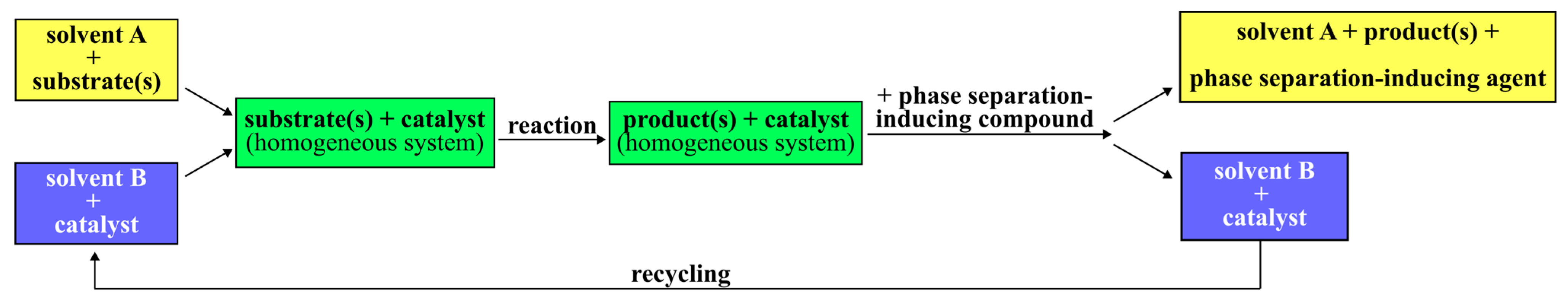- Bianga, J.; Künnemann, K.U.; Gaide, T.; Vorholt, A.J.; Seidensticker, T.; Dreimann, J.M.; Vogt, D. Thermomorphic Multiphase Systems: Switchable Solvent Mixtures for the Recovery of Homogeneous Catalysts in Batch and Flow Processes. Chem. Eur. J. 2019, 25, 11586–11608. [Google Scholar] [CrossRef]