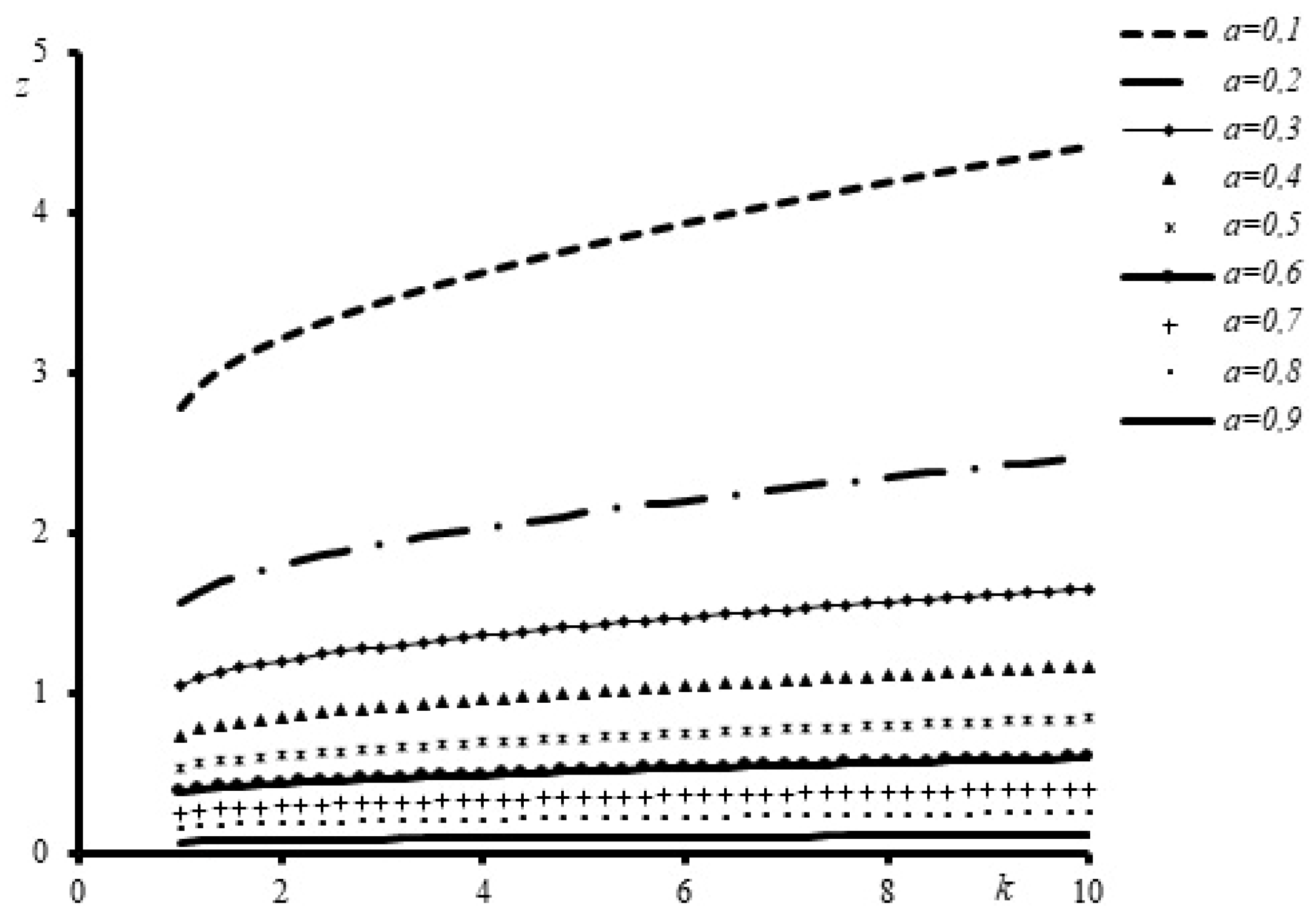 , given the nonlinear nature of the dependence (20). The results of numerical processing of the second formula from (20) show that the dependence of the lyophobicity function on the proportionality coefficient, with an accuracy acceptable for engineering calculations