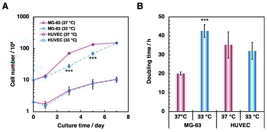 Comparison of cellular proliferation in MG-63 cells and HUVECs. To examine the effect of hypothermia on proliferation of osteoblasts and endothelial cells, cells were cultured in 6- or 24-well plates at 37 °C and 33 °C for 7 days. (A) The number of proliferating cells were counted at days 1, 3, 5, and 7 after seeding. (B) Doubling time was calculated by the ratio of the cell number during the log phase. Data were collected from six replicate samples and are shown as mean ± SD. *** p < 0.001 compared with 37 °C.