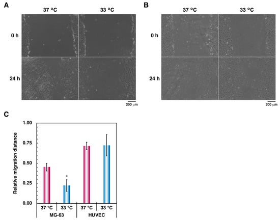 Comparison of cellular migration in (A) MG-63 cells and (B) HUVECs. To examine the effect of hypothermia on migration of osteoblasts, a scratch-wound assay was performed as described in Materials and Methods. (A,B) At the culture step, the cells were viewed with a phase-contrast microscope at 10× magnification (scale bar: 200 µm). (C) The relative migration distance was calculated by the ratio between the initial intracellular distance and the final intracellular distance. Data were collected from three replicate samples and are shown as mean ± SD. * p < 0.05 compared with 37 °C.