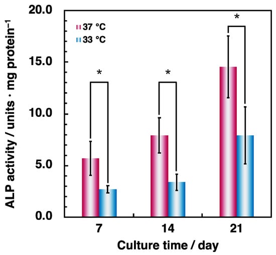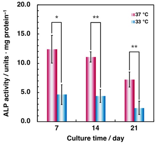 Comparison of osteoblastic differentiation in MG-63 cells. To examine the effect of osteoblastic differentiation by hypothermia, cells were precultured at 37 °C and differentiation-induced at 37 °C and 33 °C for 21 days. Intracellular ALP activity was measured at days 7, 14, and 21 after differentiation-inducing. ALP activity was assessed using the p-nitrophenyl phosphate substrate assay described in Materials and Methods. Data were collected from three replicate samples and are shown as mean ± SD. * p < 0.05; ** p < 0.01 compared with 37 °C.