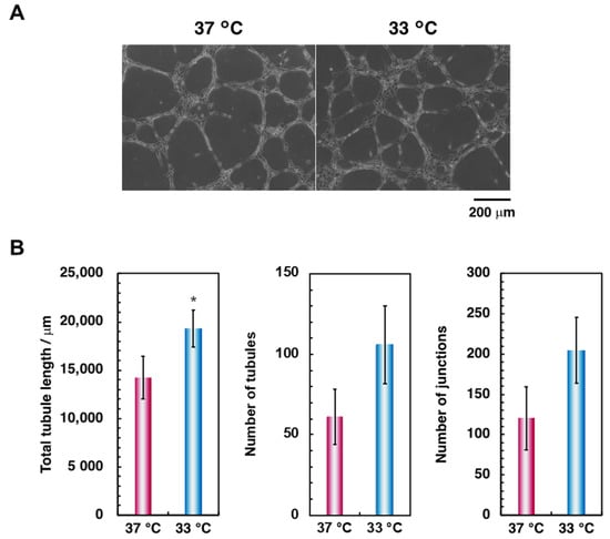 Comparison of endothelial cell tube formation in HUVECs. To examine the effect of hypothermia on endothelial cell tube formation, cells were cultured on the Matrigel® Basement Membrane Matrix at 37 °C and 33 °C for 6 h. The cells were (A) viewed with a phase-contrast microscope at 10× magnification (scale bar: 200 µm) and (B) assessed using Angiogenesis Analyzer for ImageJ software. Data were collected from three replicate samples and are shown as the mean ± SD. * p < 0.05 compared with 37 °C.