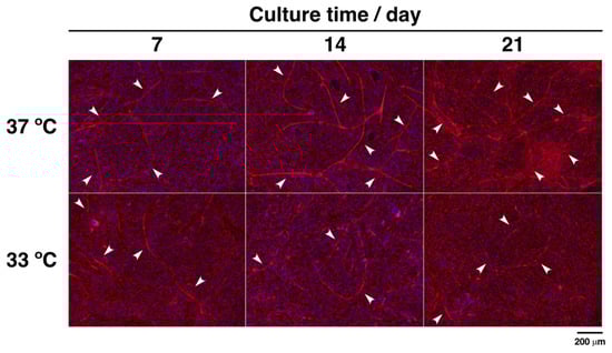 Immunofluorescence analysis of CD31 expression in co-culture cells. MG-63 cells and HUVECs were, respectively, seeded at an initial density of 2.0 × 104 cells·cm–2 and 8.0 × 104 cells·cm–2 in 24-well plates and precultured at 37 °C for 24 h. Cells were cultured at 37 °C and 33 °C for 7, 14, and 21 days. At the culture step, the cells were fixed and stained with anti-CD31 for CD31 (red) and DAPI for nuclei (blue). They were viewed with a fluorescence phase-contrast microscope at 10× magnification (scale bar: 200 µm). Arrowheads show microcapillary-like structures.