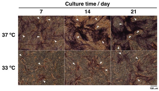 Each well of a 24-well plate was coated with 250 µL of Matrigel® Basement Membrane Matrix (Corning, Bedford, MA, USA) without trapping air bubbles and settled at 37 °C for at least 30 min as allowance for gelation of Matrigel® Matrix. HUVECs were seeded at 5.0 × 104 cells·cm–2 in each well of a 24-well plate coated with Matrigel® Basement Membrane Matrix and incubated at 37 °C and 33 °C for 6 h. At the culture step, the cells were observed under a phase-contrast microscope (CKX53-11BFK and DP21-SAL, Olympus, Tokyo, Japan). The tube formation images were quantified using Angiogenesis Analyzer for ImageJ software [].